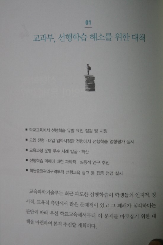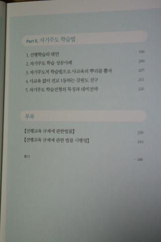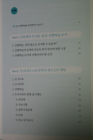 초중고를 다니고 있는 자녀들의 학부형으로서 책 제목과 같은 내용과 우리나라의 교육환경이 왜 이렇게 자주 바뀌는지에 대해 궁금한 점이 많았다. 그러나 지금은 그러한 궁금증이 많이 수그러들었다. 왜 그럴까? 그건 너무 자주 바뀌는 것이 가장 큰 원인인 듯 싶다. 수시로 바뀌는 우리나라 교육정책 일일이 쫓아가려고 하다간 과로나 화병이 들 것 같은 생각이 든다. 사교육 업계종사자들이야 사업기회가 많아질터이니 좋으리라 생각되지만 보통의 학부모들은 생각없이 살지 않는 한 살아가기 참 피곤한 교육환경의 나라다. 대부분 학부모들은 선행학습 금지의 이유로 선행학습을 위한 사교육비가 너무 많이 들어가는 것을 생각할 것이다. 그러나 그걸 어떻게 금지할 것인지에 대해서는 아직 명쾌한 해법이 나오지 못한 채 여러 주장들이 난무하고 있는 듯 하다. 이 책에서는 그 해법을 어떻게 제시할런지, 제시한 방안은 실행가능할런지 매우 궁금하였다.