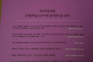 책에서도 나오지만 선행학습을 법적으로 금지하기는 어려울 것으로 보인다. 헌법재판소의 위헌판결처럼 행복추구권에 반한다는 다수의견에 대해 새로운 논리로 이를 뒤집기는 쉽지 않을 듯 하기도 하다. 그러나 책에서도 말하는 바와 같이 선행학습을 유발시키는 교육정책들, 이를테면 고교자율화나 외고나 특목고 같은 것은 폐지시켜야 조금이나마 줄어 들 듯 하긴 하다. 책에서는 그나마 가장 좋은 선행학습을 대체할 방안으로 자기주도학습으로의 유도를 들고 있는 듯 했다. 얼마나 실효성이 있을지는 모르겠지만..