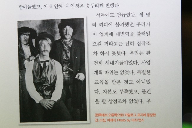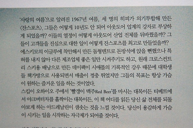 책은 스킵 요웰이라는 잔스포츠 공동설립멤버 세명 중 한 명이 지나온 과거를 쓴 회고록(?)과 같은 형식의 서적이다. 책에 쓰여진 내용은 참으로 흥미롭다. 히피의 사고방식을 가진 세 명의 젊은이(머레이 플레츠, 잔 루이스, 스킵 요웰)가 뭉쳐 회사를 설립하고 성장,발전시킨 이야기인데, 어찌 보면 지금의 벤처회사 성공담과 유사해 보이기도 하다. 하지만 이들이 창업한 시기가 60년대라는 걸 생각하면 놀라운 일이다. 이들은 당시 60년대 불었던 Love, Peace & Flower로 대변되는 히피문화의 전도사라고 저자는 말하고 있다.ㅎㅎ 책에는 요즘 유행하는 복고풍의 최첨단을 그대로 빼다 박은 사진들 꽤 나온다. 당시에는 당연히 필름카메라로 촬영하였을텐데 사진을 보니 책에 나오는 사진 촬영한 분은 기술이 대단한 사람이라 생각된다.