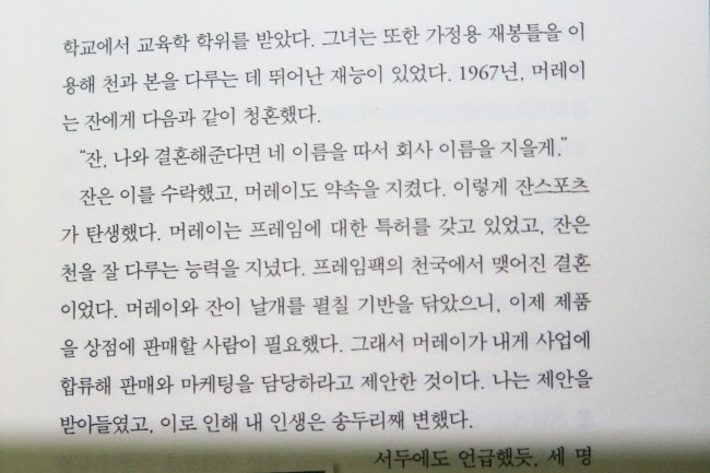 잔스포츠라는 이름으로 결정된 이유 참 독특하다. 머레이가 잔에게 청혼을 할 때 이렇게 말했다고 한다. "잔, 나와 결혼해준다면 네 이름을 따서 회사 이름을 지을께." 잔은 이를 수락했고 머레이도 약속을 지켰기에 잔스포츠라는 회사명이 탄생한거란다. 멋있어 보이기도 하고 어이없어 보이기도 하는 이러한 에피소드가 책에는 가득하다.