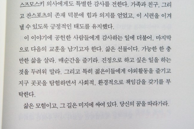 책의 말미에 정말 마음에 드는 글귀가 있었다. 그 내용은 다음과 같다. "삶은 선물이다. 가능한 한 충만한 삶을 살라. 매순간을 즐기라. 진정으로 하고 싶은 일을 하는 것을 두려워 말라. 그리고 젊은이들에게 야외활동을 즐기고 지구 곳곳을 탐험하면서 사회적, 환경적으로 책임감을 갖기를 부탁한다. 삶은 모험이고, 그 길은 미지에 싸여 있다. 당신의 꿈을 따라가라." 멋진 말 아닌가? 나도 젊은이들에게 이렇게 말해주고 싶다. "삶은 언제라도 끝날 수 있다. 그러니까 망설이지 말고 일단 부딪쳐 보라. 모든 건 자신의 마음과 행동에 달려 있다. 자신의 야망을 잃지마라. Boys be ambitious~!!" 써놓고 보니 어디서 많이 본 듯한 말인거 같아 낯간지럽긴 하다...