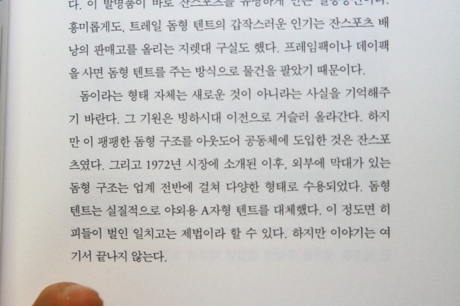 그리고 몰랐던 사실 하나. 돔형텐트를 처음 만들고 대중화시킨 회사가 잔스포츠라고 한다. 이들은 자신들이 개발한 제품을 직접 아웃도어에 들고 나가 테스트를 하는게 자신들의 의무라고 생각했다. 1971년 시험제작한 A자형텐트를 가지고 산으로 올라간 이들은 영하20도에 눈보라가 거세게 휘몰아치는 매우 안좋은 기상악화로 인해 텐트가 부서지고 날아가버리는 등 죽을 뻔한 경험을 하게 된다. 이들은 이를 계기로 유연하면서 튼튼하게 버틸 수 있는 텐트를 고민하다가 이글루를 닮은 텐트를 제작하게 되는데 이것이 바로 돔형텐트의 시작이라는 것이다. 1972년 잔스포츠를 통해 돔형텐트가 처음 아웃도어 시장에 소개된 이후 선풍적인 인기를 끌었는데, 그런 그들에게 한가지 실수가 있었다 한다. 바로 돔형텐트에 대한 특허취득을 하지 않았다는 것이다.. 아무튼 이들, 잔스포츠로부터 가볍고 튼튼한 돔형텐트는 시작되었고 지금까지 많은 아웃도어매니아들은 이 혜택을 받고 있다는 것이다.