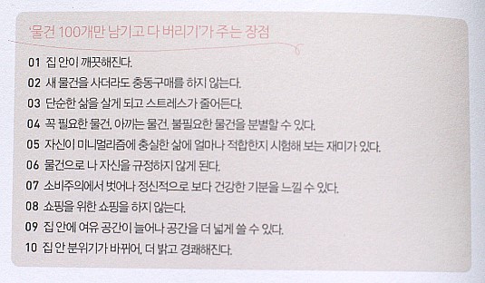 책에서 말하는 물건 100개만 남기고 다 버리기가 주는 장점. 누구나 알 수 있는 내용이다..
