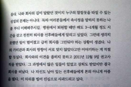 " 난 한국사회에서 철저하게 만들어진 거짓 시선의 틀에 갖혀 있었기 때문이다. 고학력에 고소득층이야 말로 뭐든지 합화된다고 여겨지는 것, 그래서인지 나는 내가 속해 있던 사회의 거짓과 분노에 회의를 느꼈다. 마치 결혼회사의 등급제 같은 인생을 추구하며 살아가라고 권유하는 세상에서 너무나 그 사회에 알맞게 잘 살아온 나를 나중에 깨닫게 됐다."