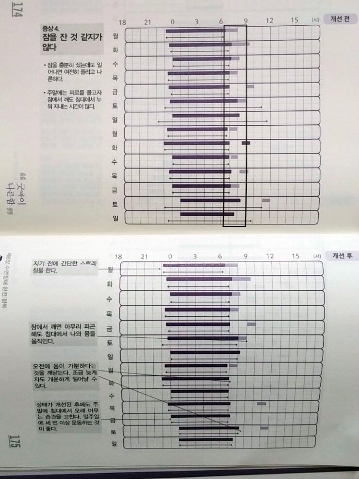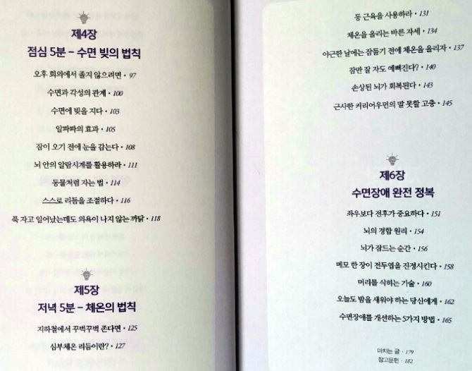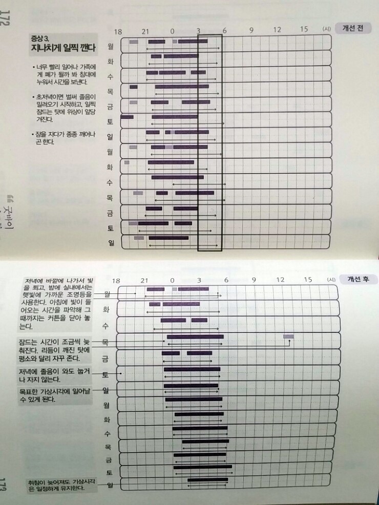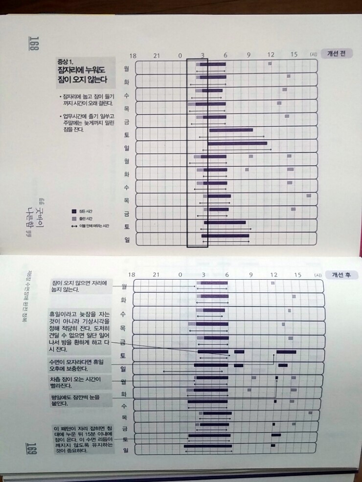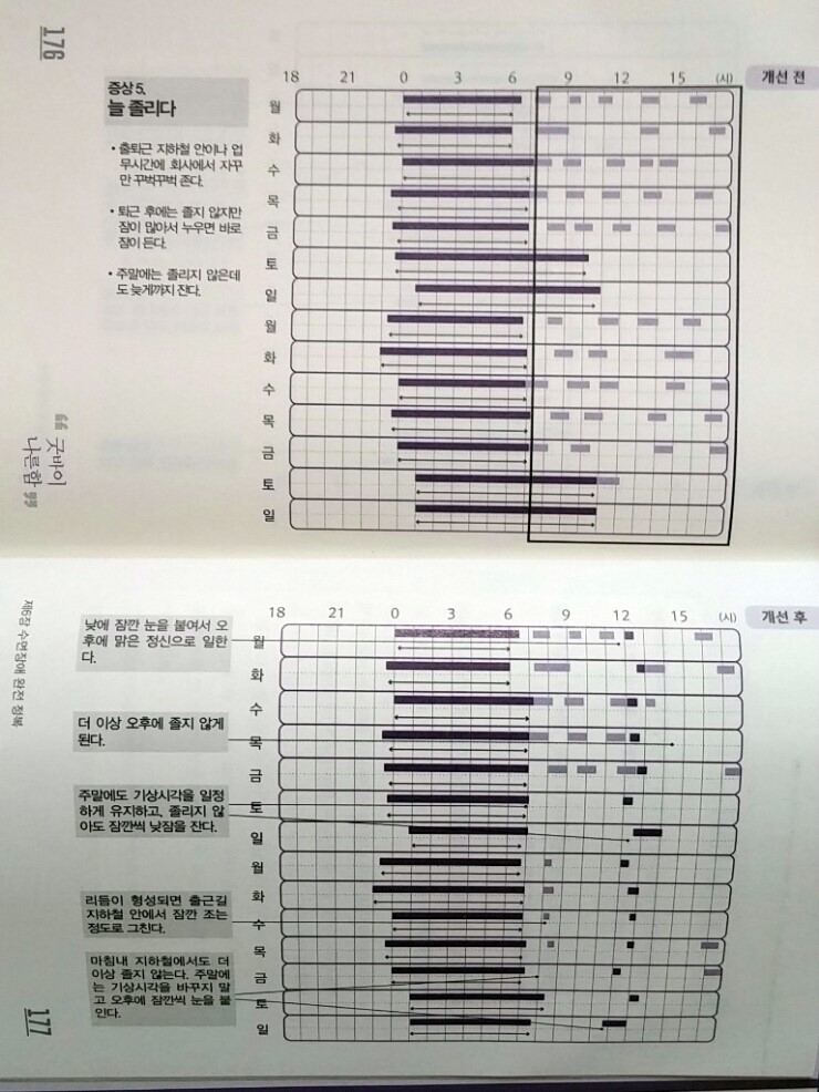 책에는 수면장애 5가지에 대해 개선하는 방법들을 제시하고 있다.