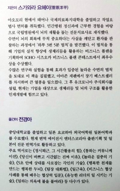 저자는 일본의 국립병원에서 뇌의 재활을 돕는 전문치료사로 재직하면서 수면이 뇌의 회복에 무척 중요하다는 걸 깨달았다고 한다. 환자를 관찰하면서 '하루 3번 5분 법칙'이란걸 발견하여 이 법칙을 통해 생체리듬을 활용하는 비즈니스 플랜을 기획하였고, 많은 연구와 실험을 통해 효과가 입증된 수면의 법칙을 토대로 본 도서를 집필하였다고 한다. 서양인이 아닌 동양인 의사의 실험연구 결과를 가지고 집필한 책이니만큼 그 내용들이 한국인에게도 어느 정도 들어 맞지 않을까 하는 생각이 든다.