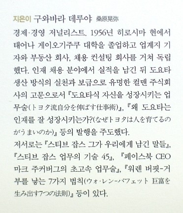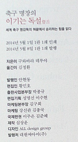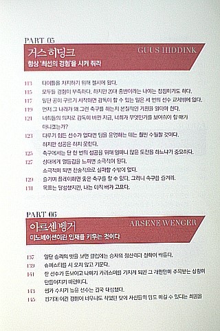 저자는 일본인인데 생각과는 달리 축구계에 종사하는 사람이 아닌, 경제경영 저널리스트가 주업인 사람이다. 집필한 저서도 <도요타식 자신을 성장시키는 업무술>, <스티브 잡스 업무의 기술 45>, <웨펜 버핏-거부를 낳는 7가지 법칙> 등 경영과 경제와 관련된 내용의 책을 주로 집필하였다. 생뚱맞다는 생각이 들기도 했지만 책의 프롤로그에는 저자가 왜 축구감독에 대해 쓰게 되었는지가 자세히 나온다. 자신이 오랫동안 취재하던 경영자가 자주 한 말이 있단다. "세상에 좋은 사원, 나쁜 사원이 어디 있나. 좋은 경영자와 나쁜 경영자만 있을 뿐이다."라고. 저자는 이를 '나쁜 사원이 있다고 해도 전부 갈아치우기는 힘드므로 부족하더라도 지금 있는 사람들의 힘을 이끌어내어 좋은 성과를 내는게 좋은 경영자이고 그렇지 못하면 나쁜 경영자'라고 해석했고 이러한 시각에서 축구 명감독을 되돌아 보게 되었다 한다. 흠흠. 공감가는 대목이다. 조직을 이끌어 나가는데 가장 중요한 것은 팀웍이라는 것은 경영이나 스포츠나 군대나 다 마찬가지이니까 말이다.