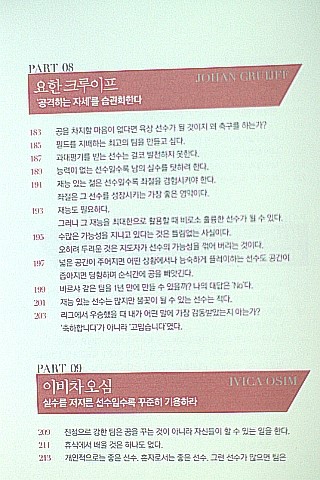 책에 나오는 감독은 총 15명이다. 그중 6명은 뭉뚱그려 나오고 있기에 실제 자세하게 기술된 축구 명감독은 9명이다. 읽다가 느낀 점인데 기술된 순서는 저자의 선호도에 따라 순서가 결정된 듯 보인다. 나의 경우엔 공격축구를 선호해서 그런지 요한 크루이프의 내용이 가장 흥미있었고 호감 갔었다.