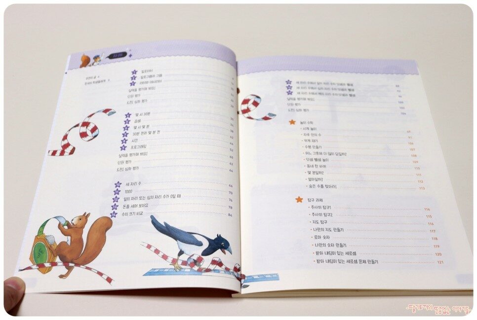 시계놀이, 자루 안의 수, 무게 재기, 수평 만들기, 어느 그릇에 더 많이 담길까?, 덧셈 빨셈 놀이, 동네 한 바퀴, 몇 분일까?, 얼마일까?, 숨은 수를 찾아라! 로 재미있게 놀이하며 수학을 공부하게 되고요.