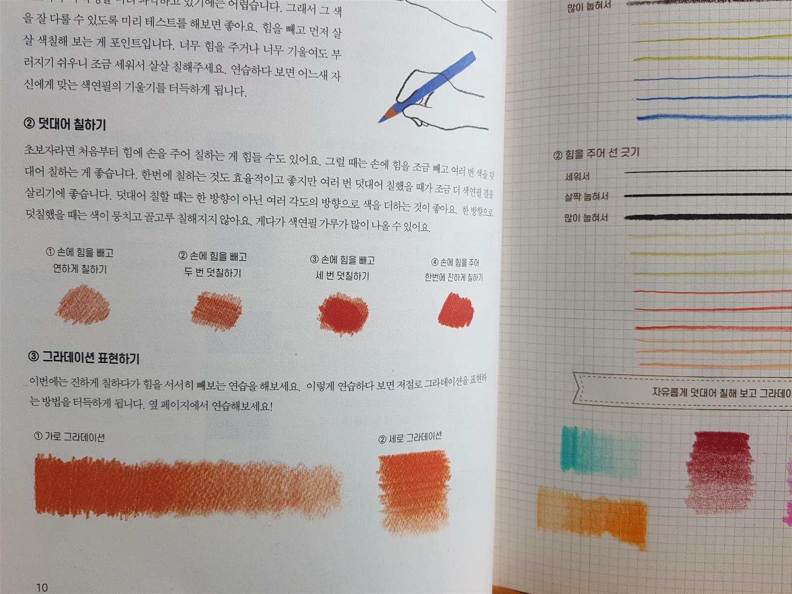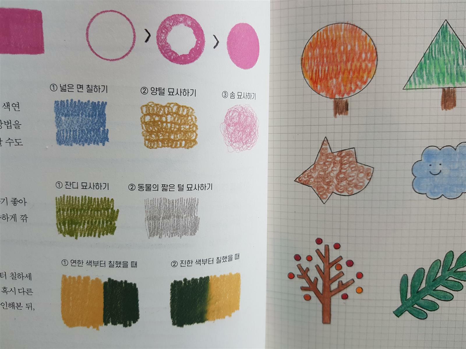 색연필 기울기에 따른  질감표현, 덧대어 칠하기, 그라데이션 표현하기 등
