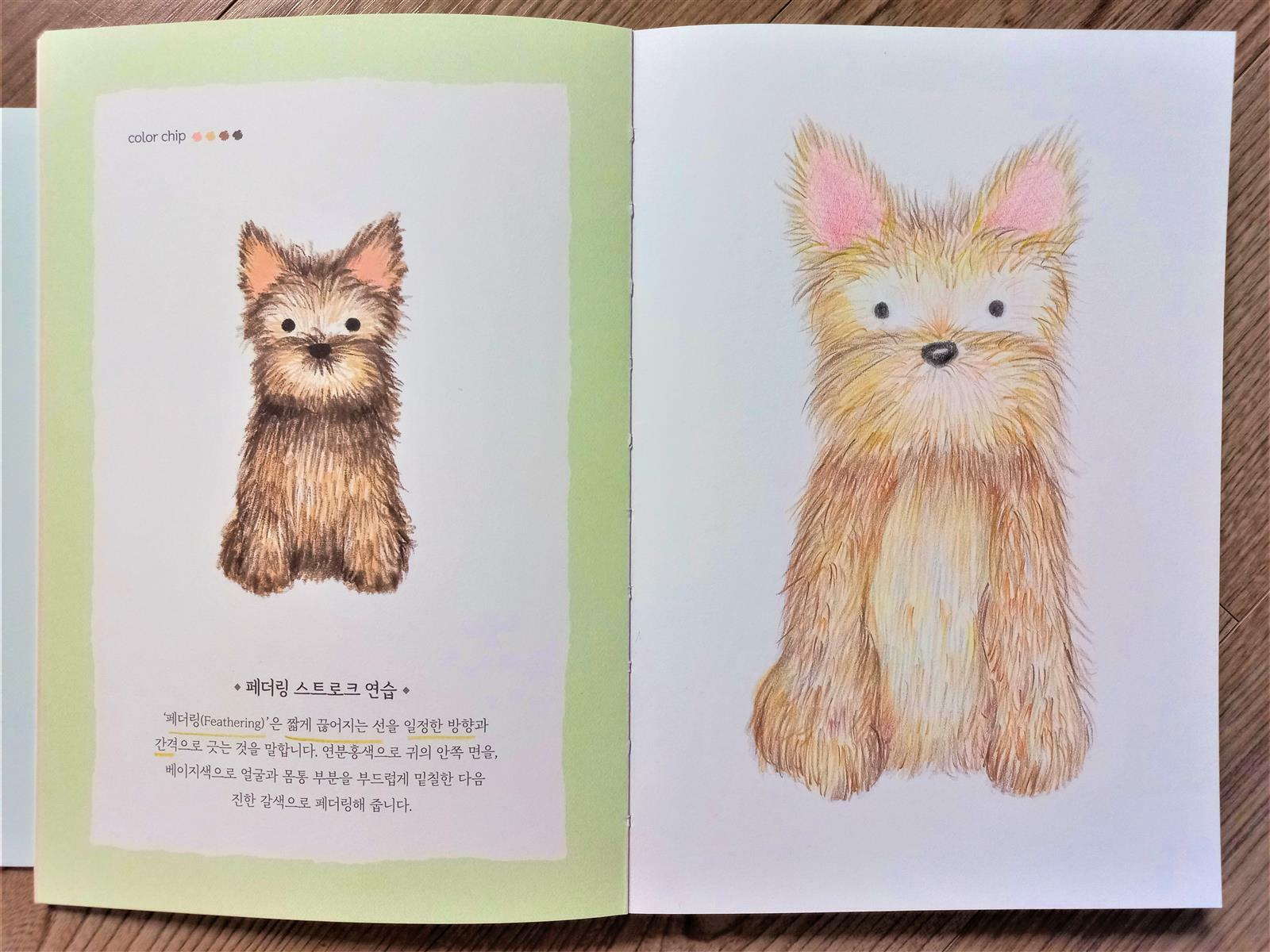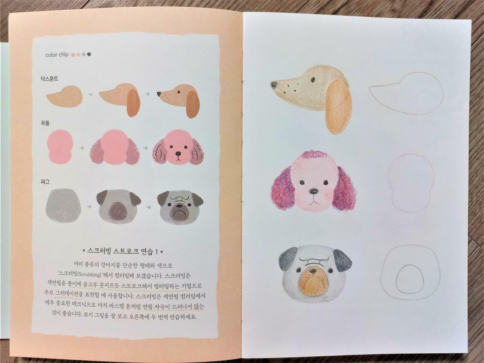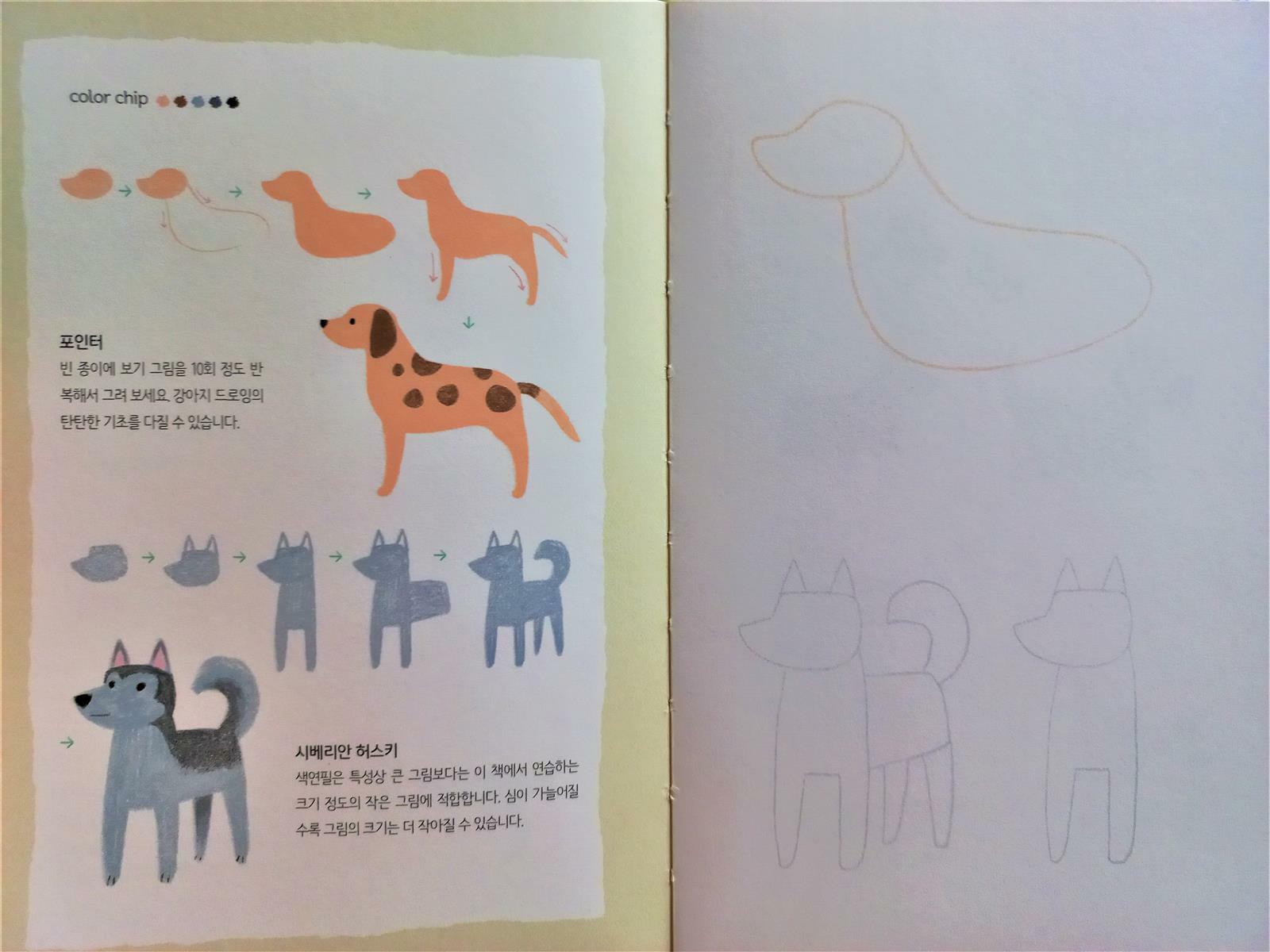 강아지에 대한 설명과 더불어 드로잉방법과 컬러링방법이 쉽고 친절하게 설명되어 있어서