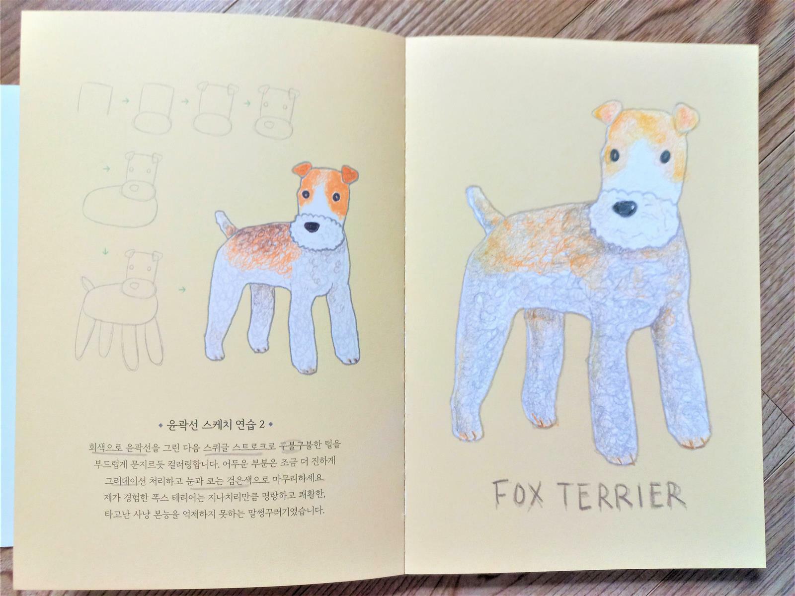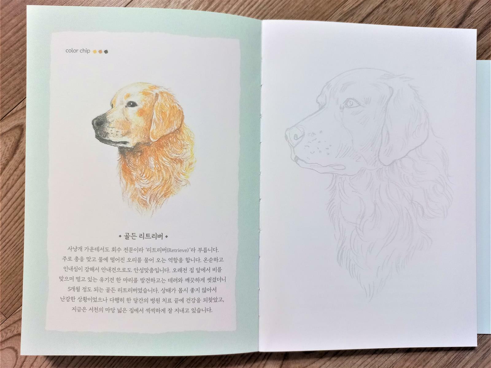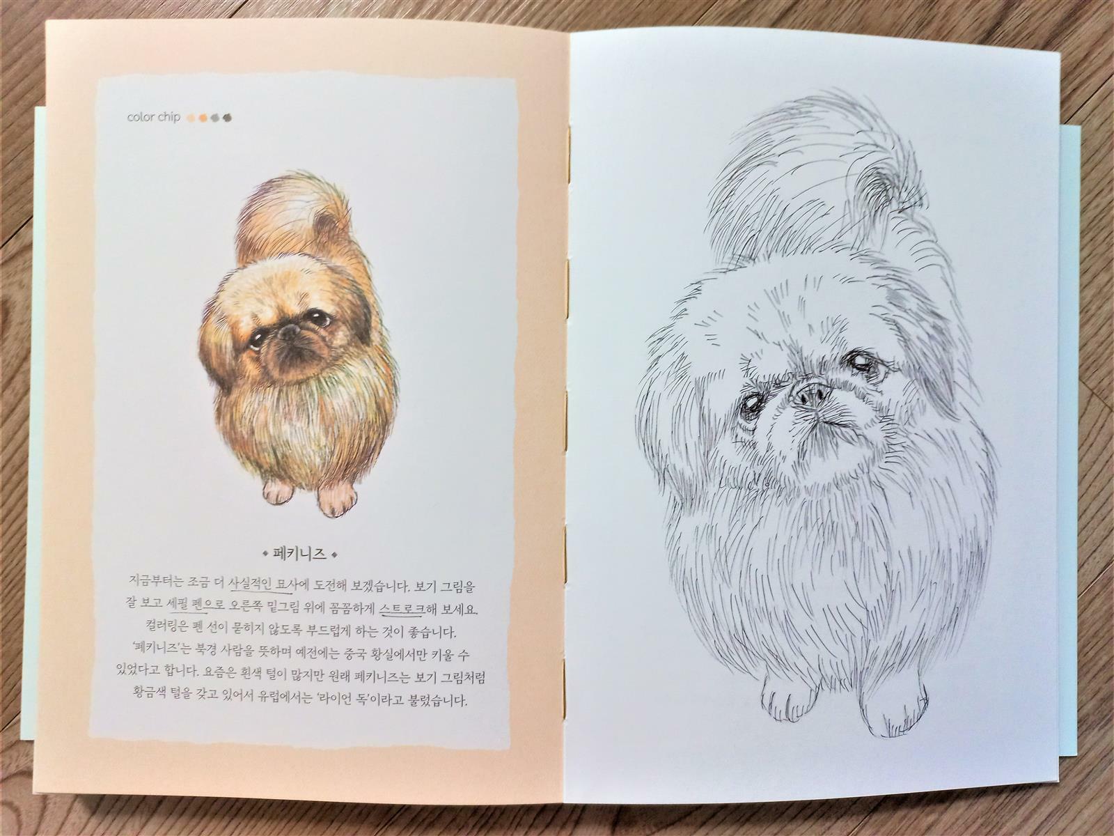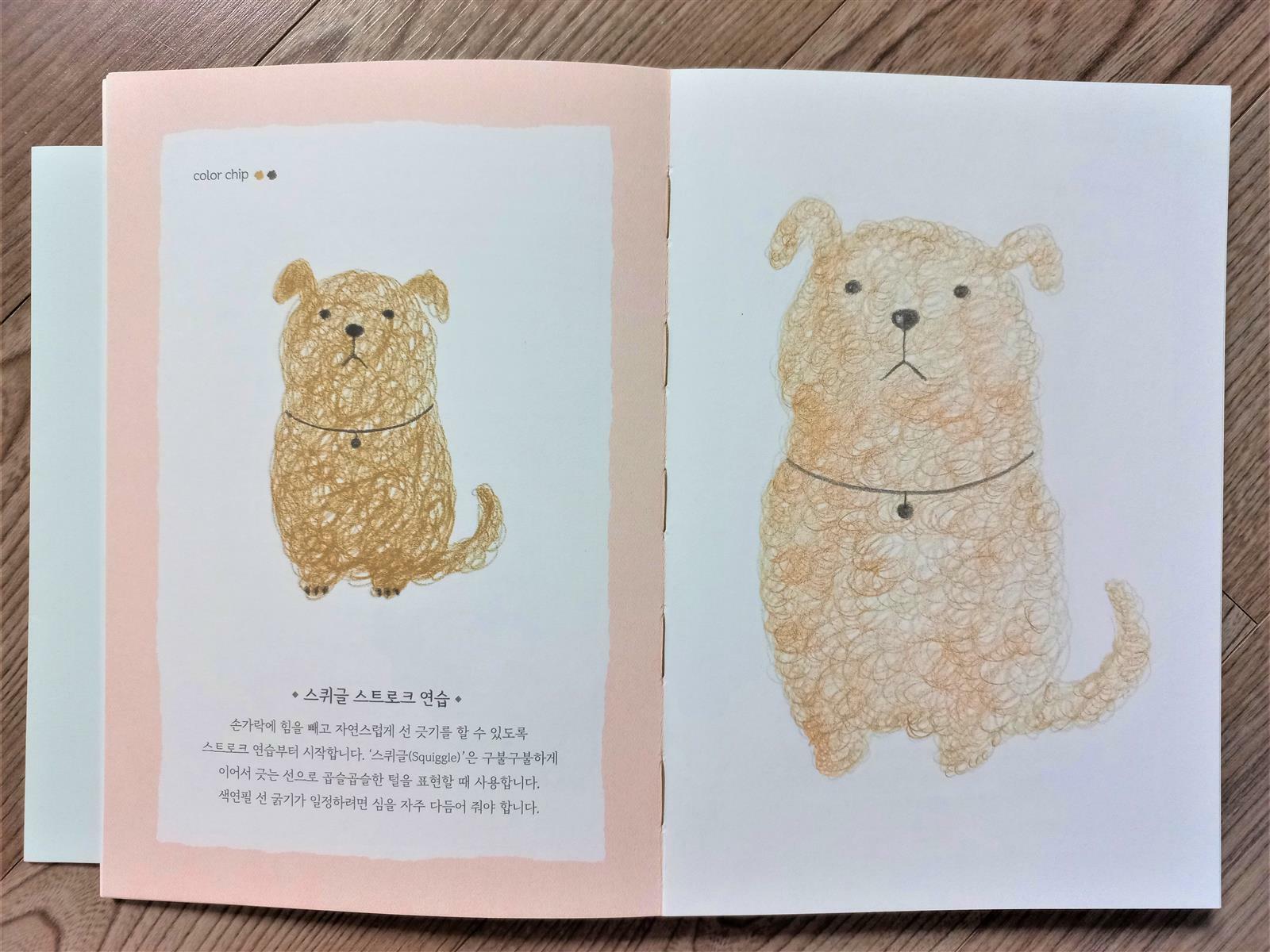 강아지에 대한 설명과 더불어 드로잉방법과 컬러링방법이 쉽고 친절하게 설명되어 있어서