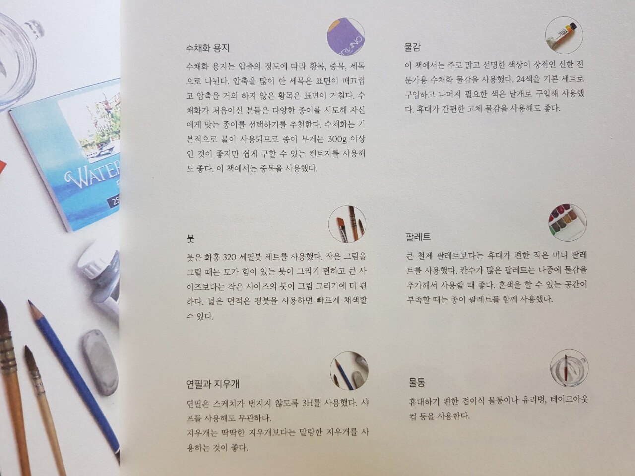 수채화 용지, 물감, 붓, 팔레트, 연필과 지우개, 물통 등의 간단한 설명을 통해