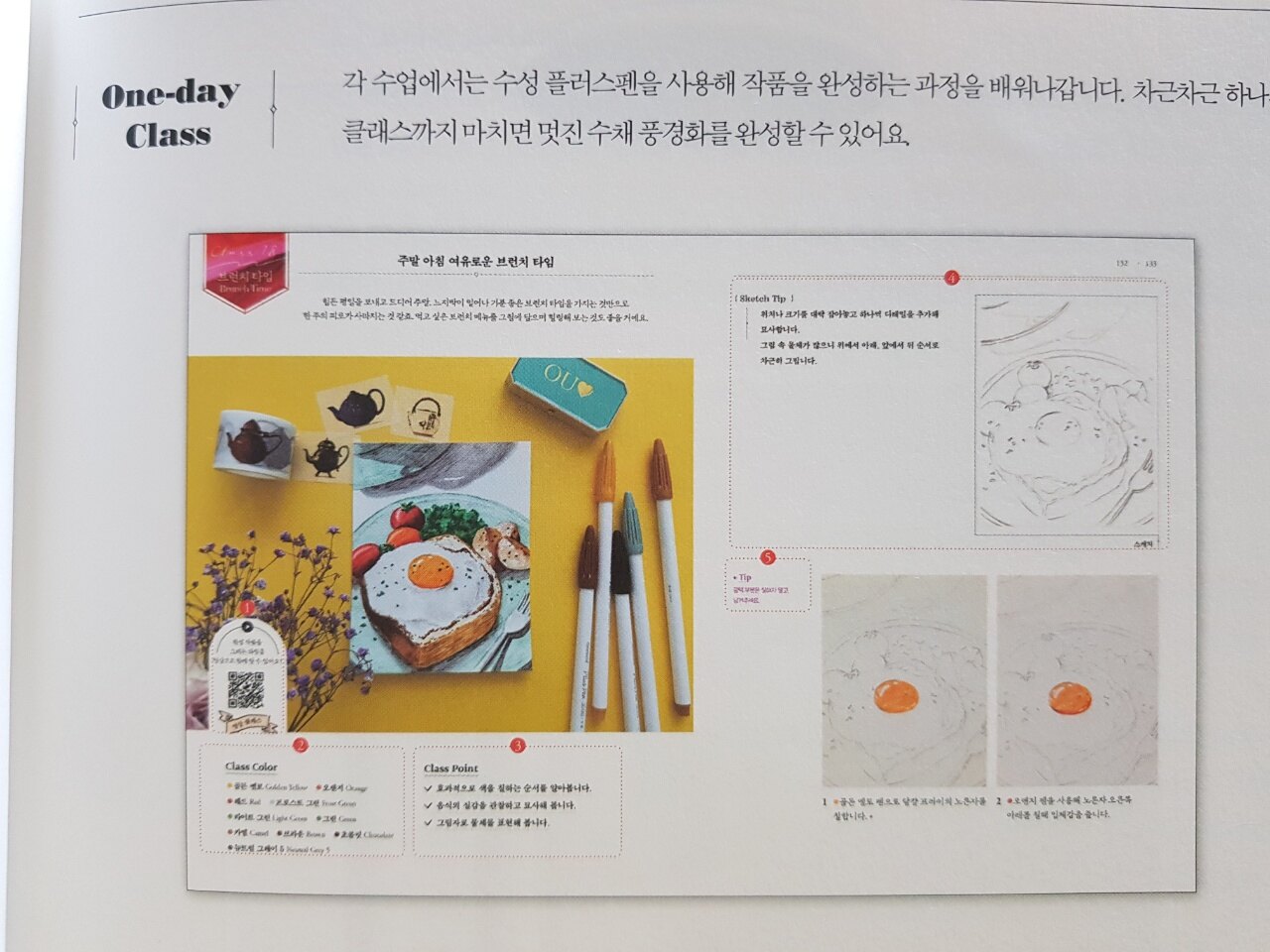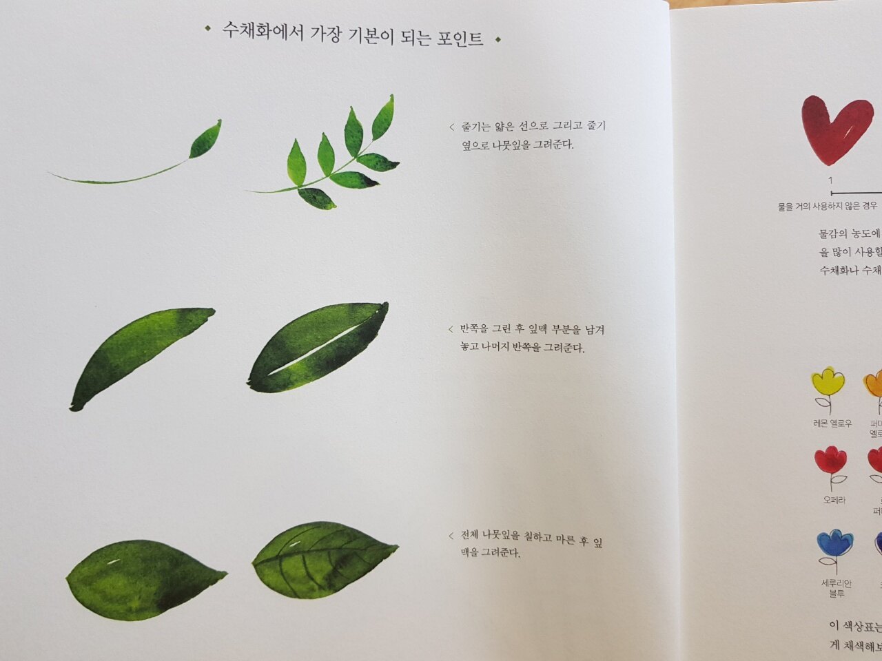 오른쪽 페이지에 스케치 예시가 있고, 그 아래부터 작가님의 수채화 클래스강의가 시작됩니다.