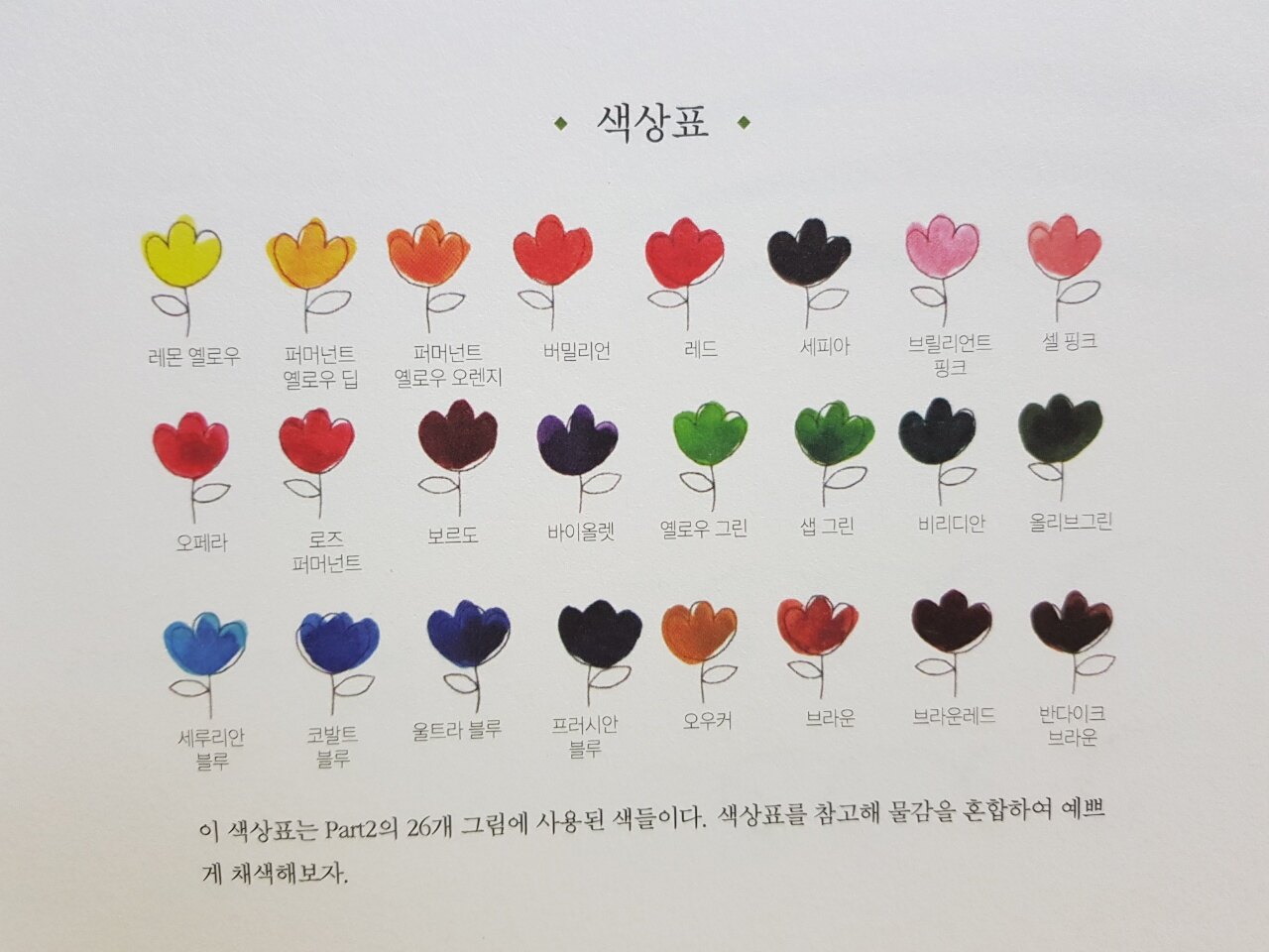 꽃다발 수채화 컬러링 북에서 사용한 24색의 색상표가 제시되어있습니다.