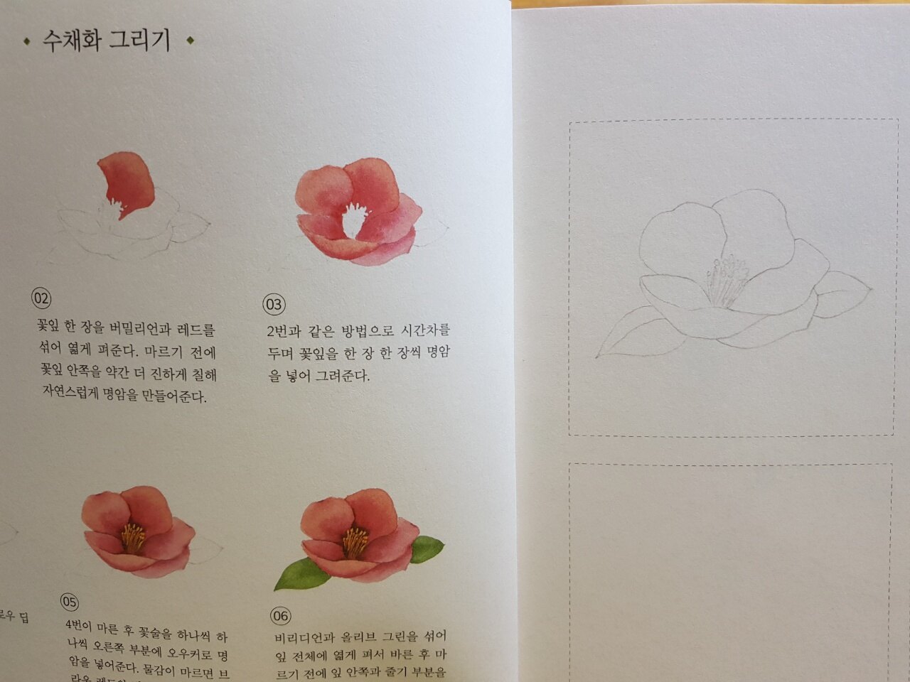미니 수채화레슨 편에 제공된 기초선 그리기와 나뭇잎 채색하기, 동백꽃 색칠하기 등의
