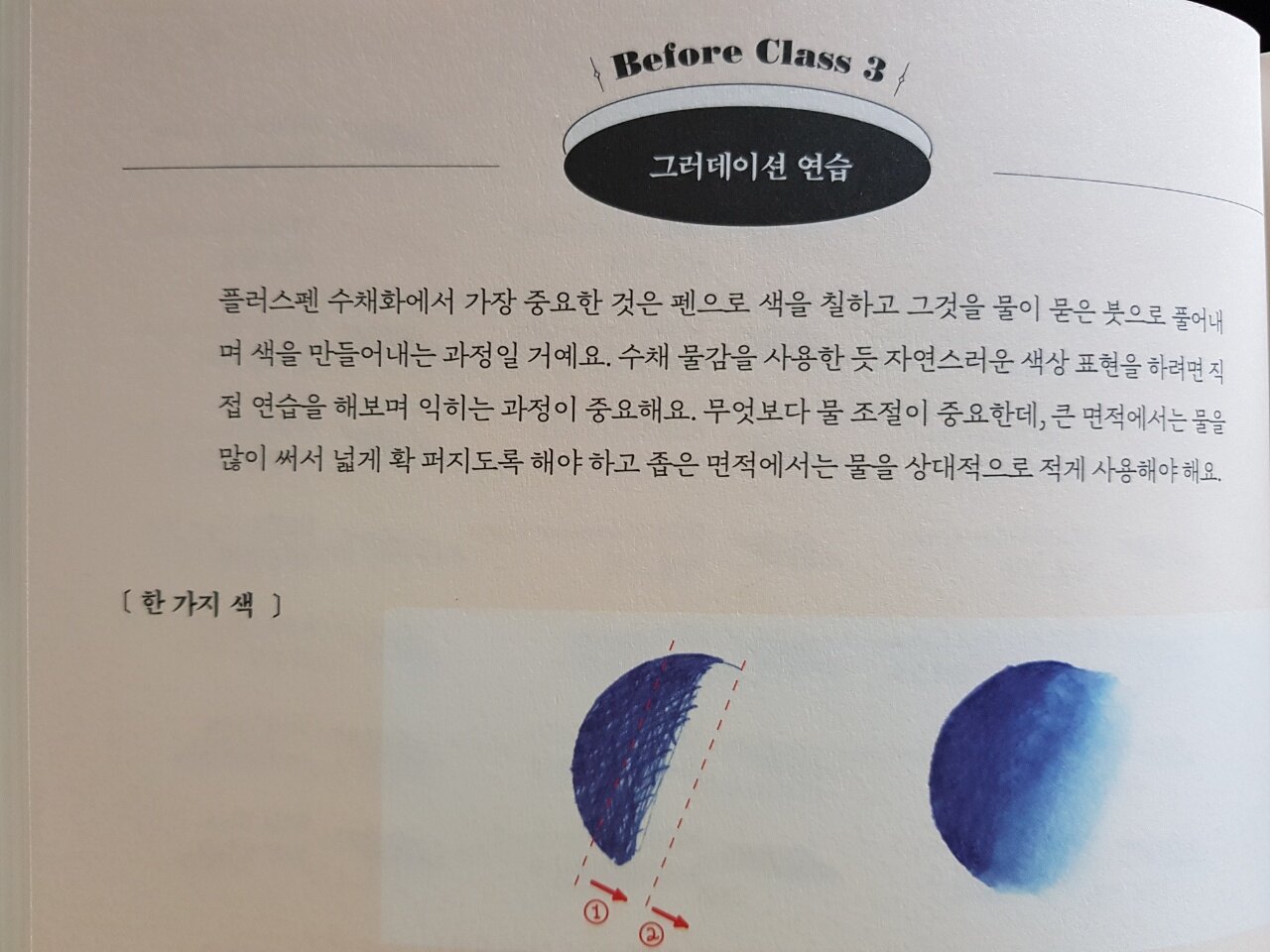기본 준비물을 마련한 후 수채컬러링을 시작하기 전, 기본이 되는 기법에 대해 설명을 하고 있습니다.
