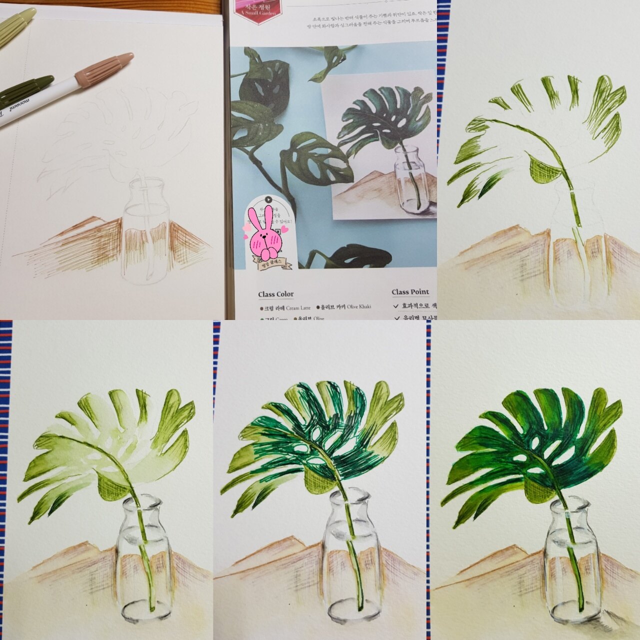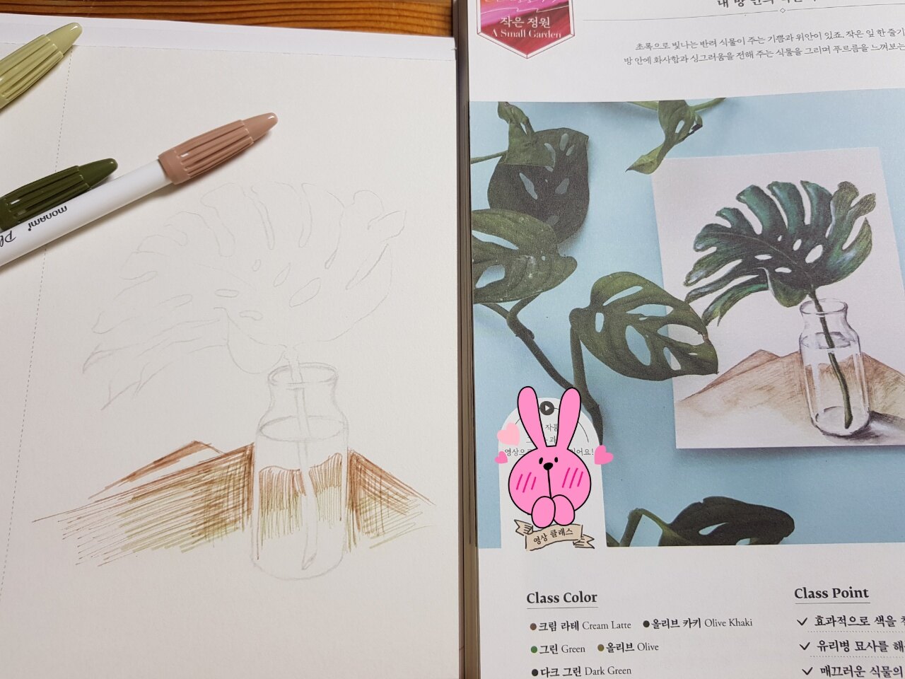 저는 Chapter 4. 나의 일상 기록 중 class 17 나의 작은 정원 내방안의 작은 푸르름 도안을 채색해보았습니다.