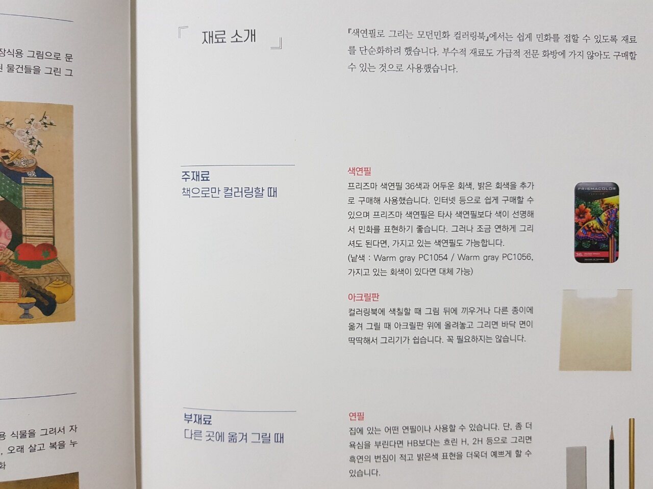 프리즈마 36색 색연필, 아크릴판, 연필등의 재료들이 사진과 함께 안내되어 있어서