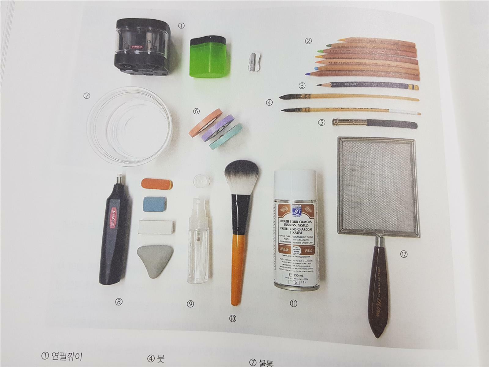 기본이 되는 수채색연필과 더불어 연필깎이, 붓, 물통, 지우개, 종이, 분무기 등을