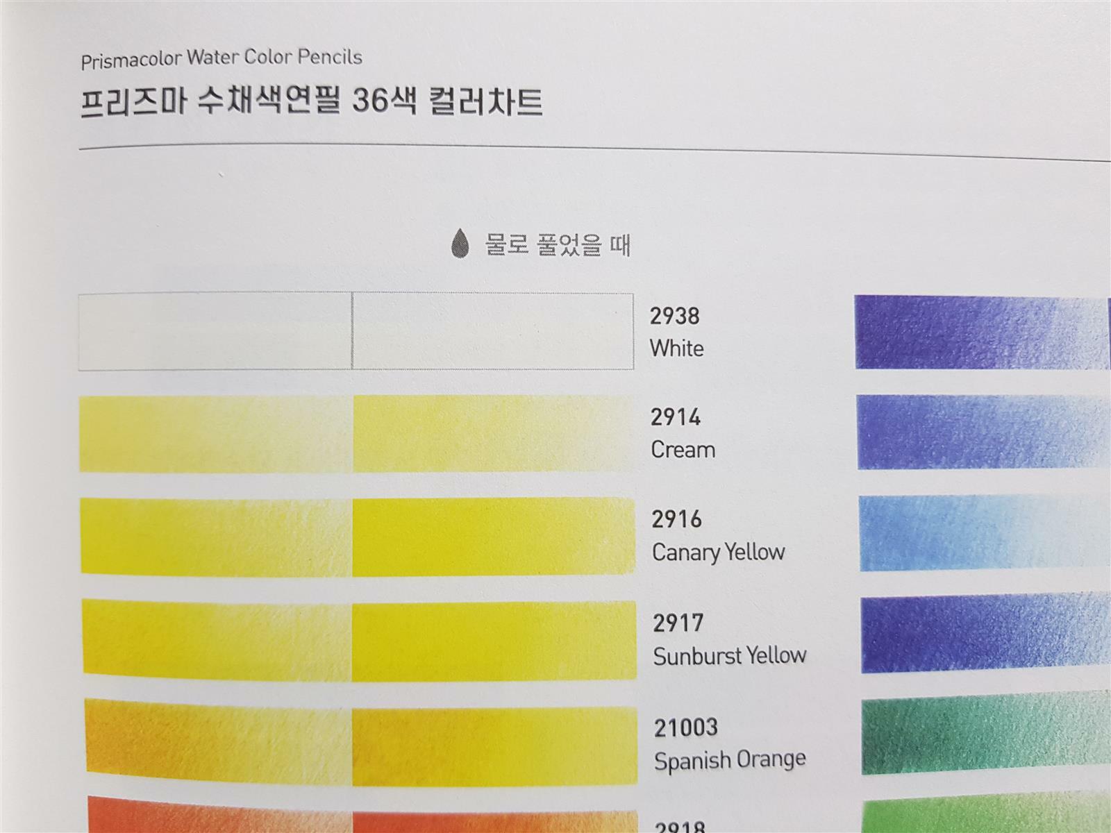 작가님께서 사용하신 프리즈마 수채색연필 36색 컬러차트가 수록되어있고요,