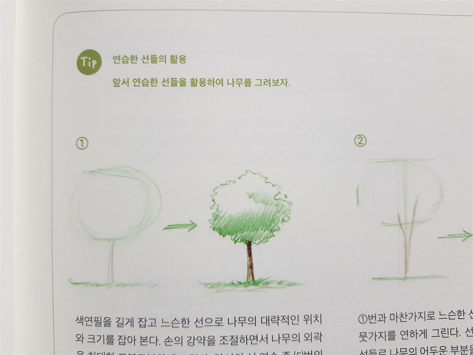 색연필 잡는 방법부터, 다양한 종류의 선그리기, 선들을 활용한 나무그리기,