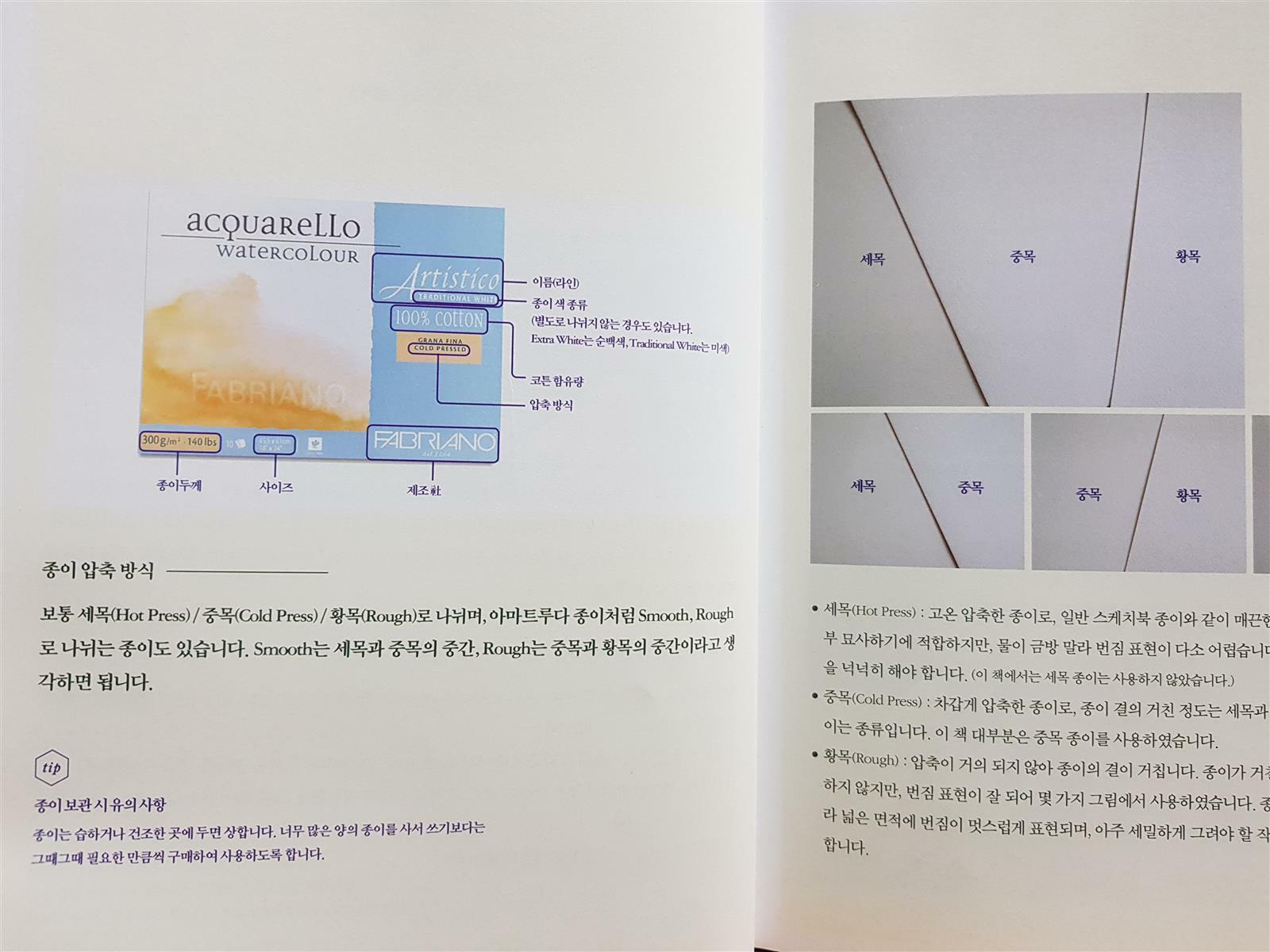 물감과 더불어 수채화를 그릴 때 중요한 재료 중의 하나인 종이 소개 장면입니다.