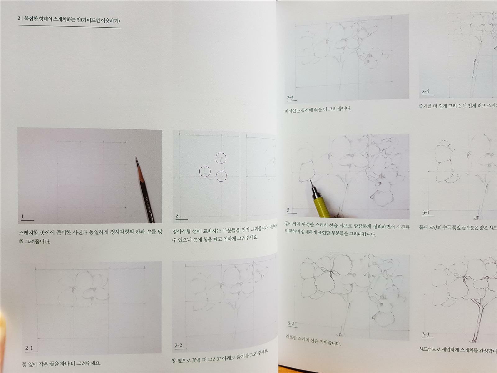 간단한 형태의 스케치하는 법, 가이드 선 이용하는 법, 트레싱지를 이용해 스케치를 옮기는 방법으로 나누어