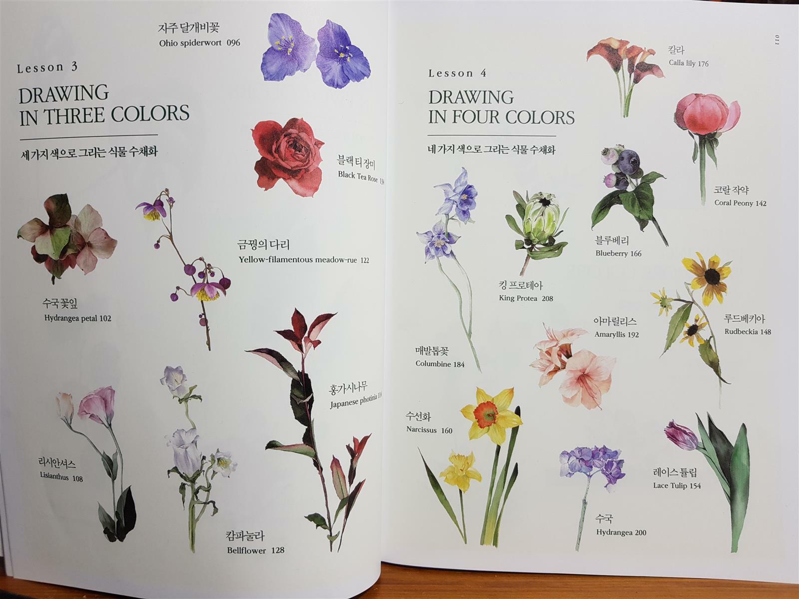 한 가지, 두 가지, 세 가지, 네 가지, 더 많은 색으로 그리는 식물수채화로 나누어 레슨이 시작됩니다.