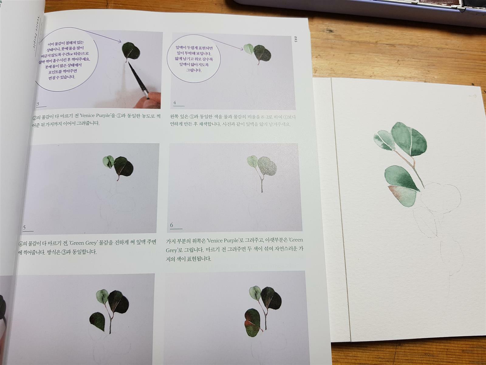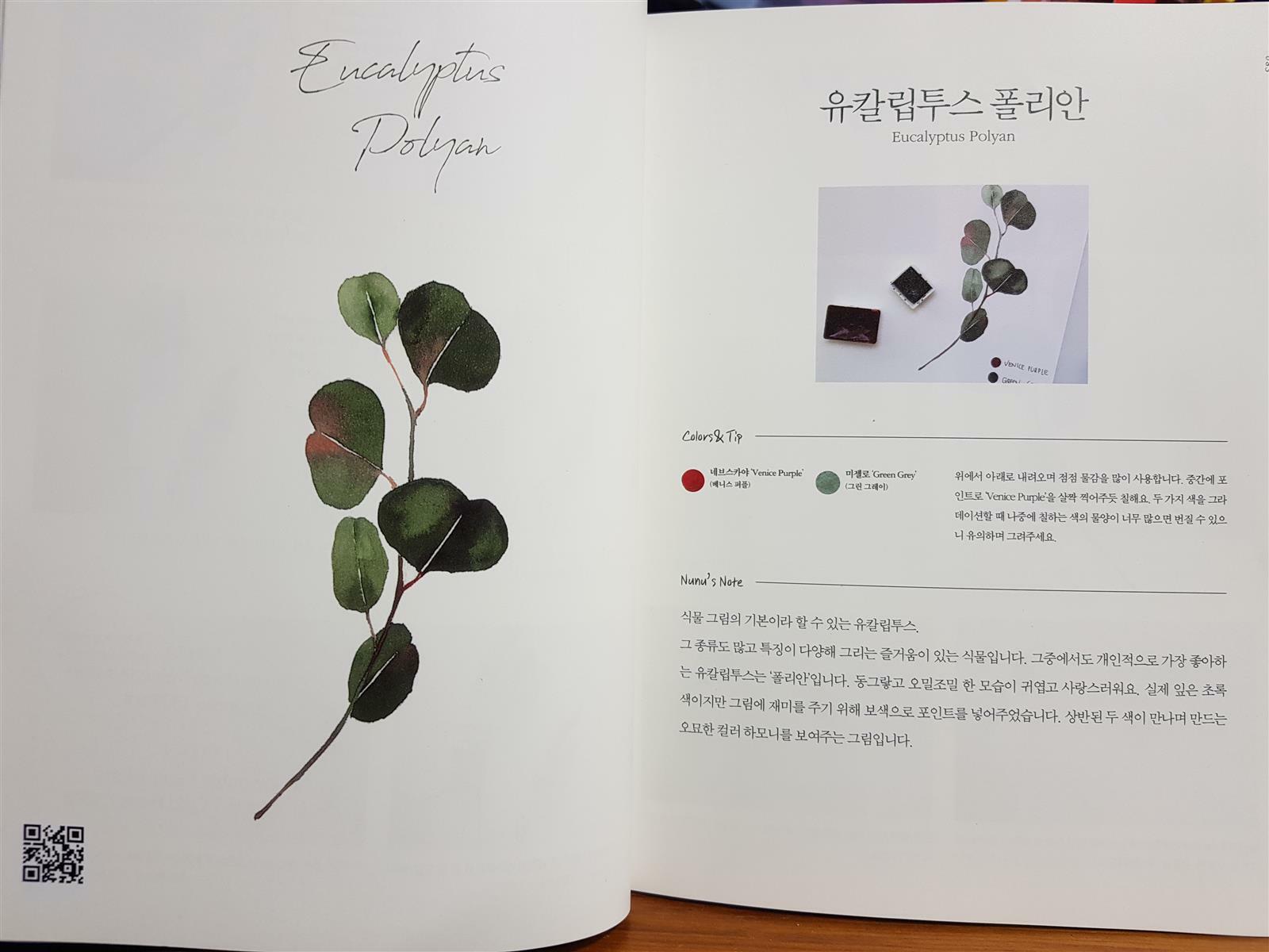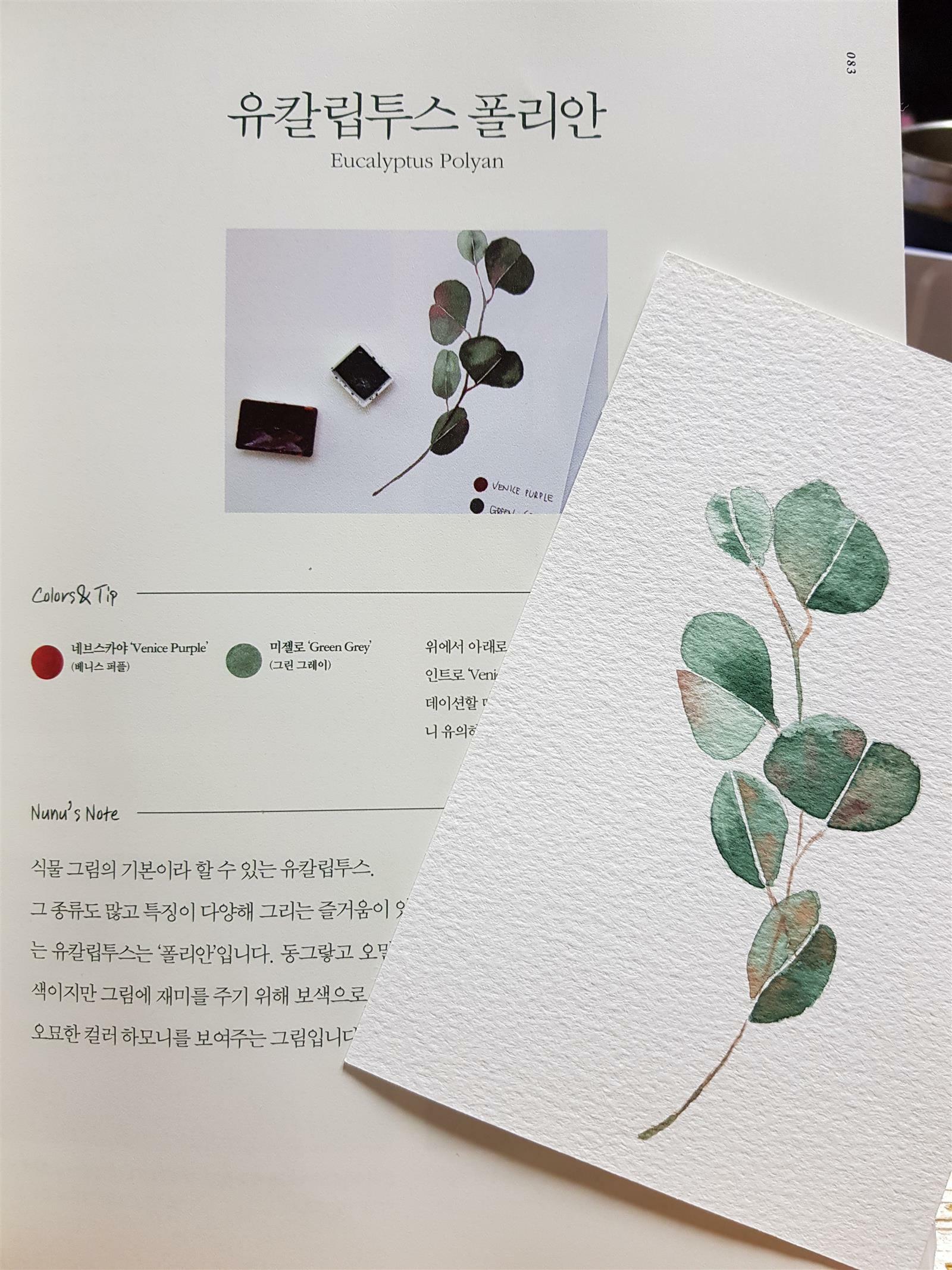 유칼립투스 폴리안 작품, 작가님이 사용하신 컬러와 팁, 유칼립투스를 그리기 위한 전체적인 설명이 되어있어요.