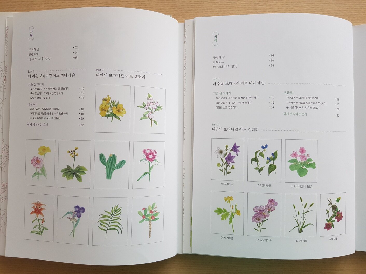 들꽃 편의 목차를 자세히 소개드리면, 총 23개의 예쁜 들꽃들이 수록되어있습니다.