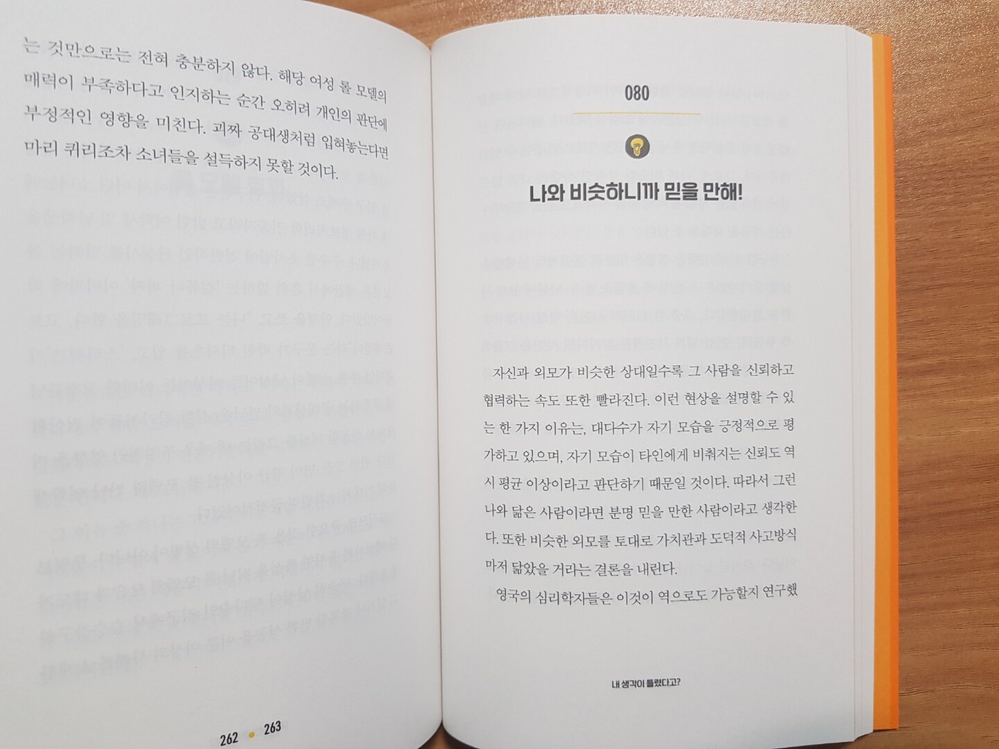 제가 재미있었던 주제는 사고와 판단챕터에 있던 나와 비슷하니까 믿을만해! 입니다. 신뢰할 만한 사람이 외형적으로 나와 비슷한 외모를 지녔는지에 대한 실험을 통해 우리가 유사성에 의해 사람에 대한 신뢰가 변화하는지 흥미롭게 알아볼 수 있었습니다.