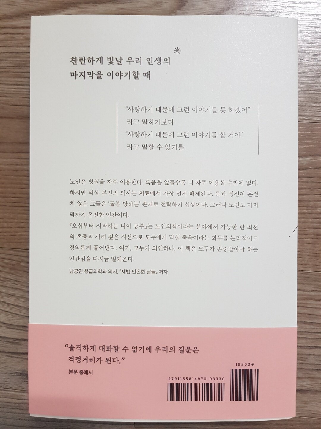 늙고 죽는 것은 누구에게나 찾아오는 자연스러운 것인데 함께 이야기 나누는 것은 참으로 불편하다. "솔직하게 대화할 수 없기에 우리의 질문은 걱정거리가 된다."는 문구가 주는 울림이 컸다.