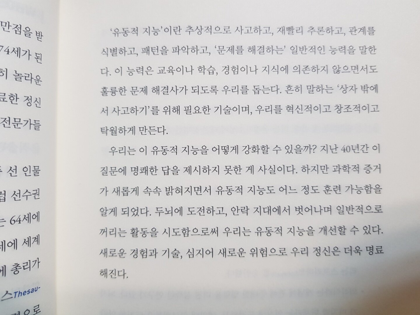 일반적인 믿음과는 다르게 뇌 기능은 나이가 들어감에 따라 떨어지는 것만은 아닙니다. 어떤 이들은 나이를 먹을 수록 정신적으로 성장한다는 연구도 있습니다. 대부분의 경우 두뇌기능은 대단히 안정적인며 사람들은 결정적 기능이라 부릅니다. 세월에 따라 유지하기 힘든 것은 유동적 지능입니다. 과학적 증거가 새롭게 계속 밝혀지면서 유동적 지능도 어느정도 훈련이 가능함을 알게 되었습니다.