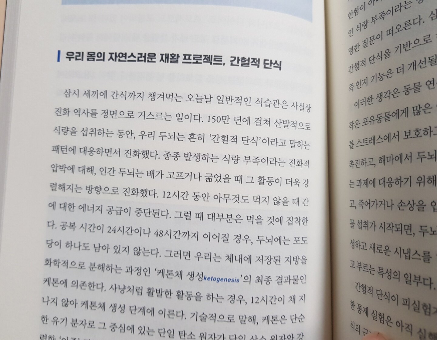내장은 두번째 뇌다. 두뇌에서 내장으로 이어지는 미주신경은 거대한 감각기관이다. 20~30퍼세트의 칼로리 제한은 거의 모든 생명체에서 수명을 연장하고 노화 관련 질환을 늦추는 효과적인 식이요법이다. 과학적 증거들은 대부분 과식이 두뇌에 좋지 않다고 말하고 있다.