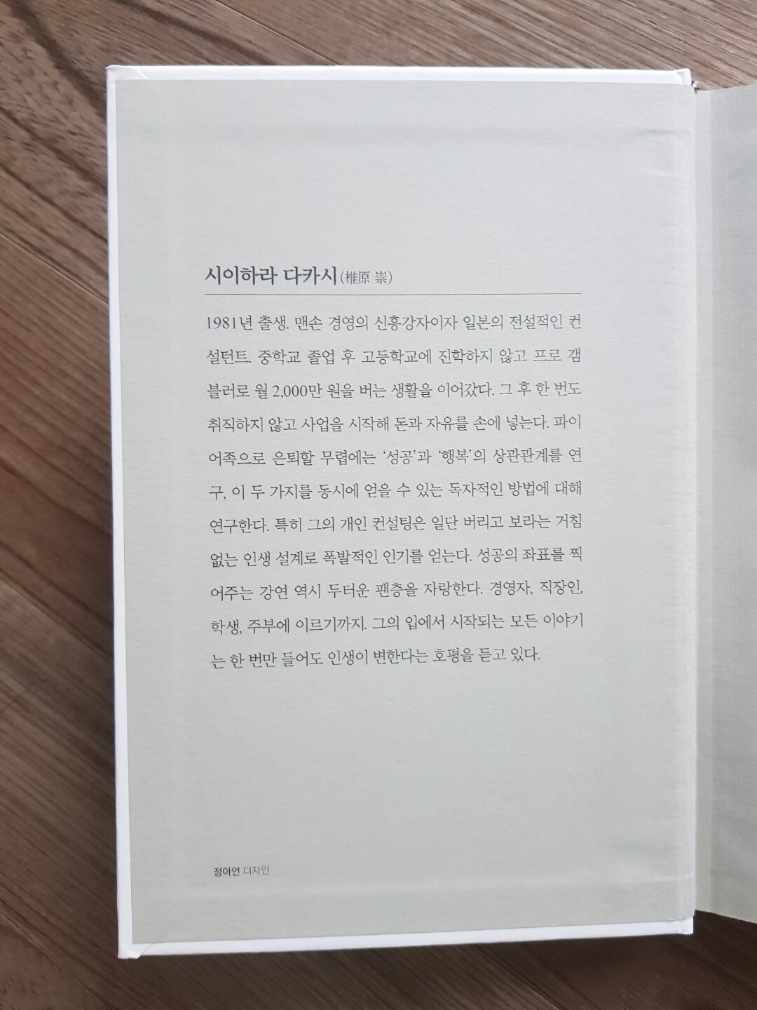 이 책의 저자이신 시이하라 다카시님은 맨손경영의 신흥강자이며 취직하지 않고 사업을 시작해 돈과 성공을 이루었다고합니다. 성공과 행복을 동시에 얻을 수 있는 방법에 대해 연구하였고 버리고 보라는 거침없는 인생설계로 폭발적인 인기를 얻었다하니 그가 들려줄 이야기를 기대하는 마음으로 책을 읽기시작했습니다.