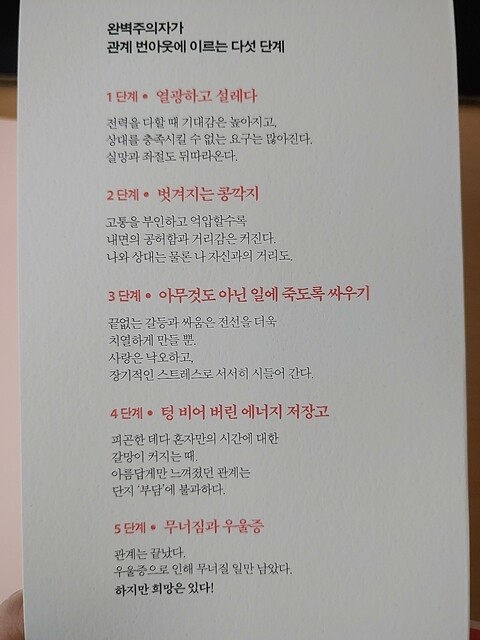 과거의 연인과는 참 많이 싸웠는데 이 책에서 나오는 여러 징후들을 많이도 겪었던 것 같다. 그것이 지긋지긋해서 다시는 겪고 싶지 않다는 생각이 든다.