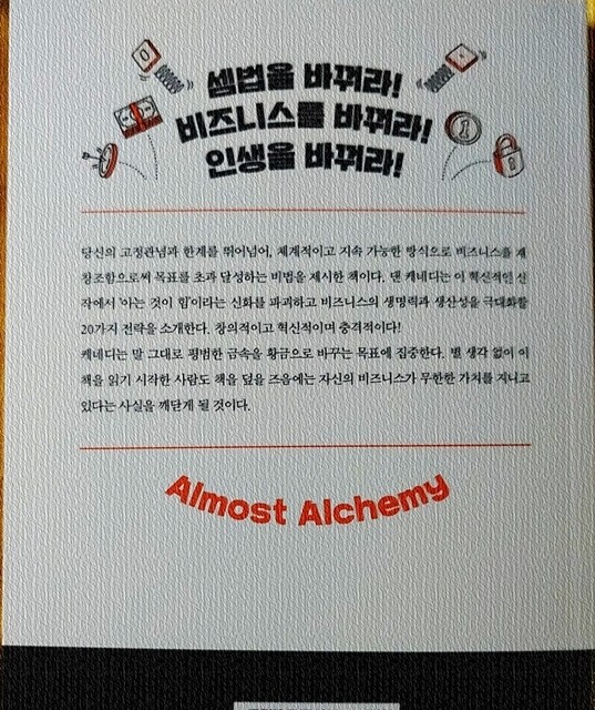 제목으로는 다소 독특하고 과격?한 '망할 멍청한 때려치워라' 가 들어가는데, 원제는 그냥 almost alchemy, 그냥 직역하면 모든 연금술 정도일 것인데 '모든 비지니스에 통하는 연금술' 이란 뜻인것 같다. 어쨋든 그 망할 멍청한~ 이런 과격한 제목은 한국에서 붙인듯. 미국에서는 댄 케네디라는 저자가 유명하여 이름만 대면 팔리지만 한국에서는 아니므로 눈에 띄는 작명을 한 것이 아닐까. 뭐 책 본문에 이런 과격한 이야기들이 자주 등장하기는 한다.