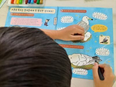 괭이갈매기와 바다제비를 색칠하면서 생김새를 아주 자세히 설명해주네요. 아기새와 알 스티커도 붙여주구요. 보송보송한 아기새를 보고 귀여워서 어쩔 줄을 몰라요.