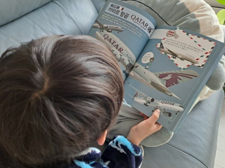 아이가 뒹굴거리며 책을 보고 있을 때 몰래 한 컷 찍으려 했는데 들키고 말았어요. 자기는 카타르 항공이 제일 멋지다며 카타르 항공을 보는 사진을 찍어달라고 특별히 주문했답니다. 월드컵이 영향이 아닌가 개인적으로 생각해 봅니다.