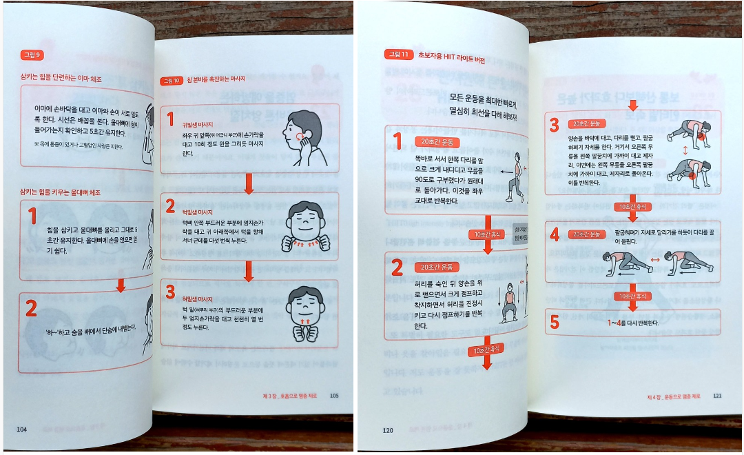 책 중간부분 본문을 살펴보면 염증을 없앨 수 있는 각종 스트레칭과 마사치 하는 방법들이 골고루 소개되어 있는 걸 볼 수 있다. 당장이라도 바로 해볼 수 있는 동작들이라서 누구나 나이 상관없이 해낼 수 있는 운동이라서 매우 간편하고 하기가 좋다고 생각하게 된다. 염증을 없애기 위해 근육을 무조건 키워주는 게 필요하고, 염증덩어리가 자주 가게 되는 부위를 자주 마사지를 해주어야만 열이 나지 않고 얼굴이 좋아지는 현상이 나타난다. 이 책에 담아진 내용은 하나같이 운동을 안하다가 이제서야 하게 되는 초보자 기준으로 만들어진 것이라서 어려운 동작은 전혀 없으므로, 이 책을 활용성이 좋은 도서로 쓰면 좋을 거 같다.