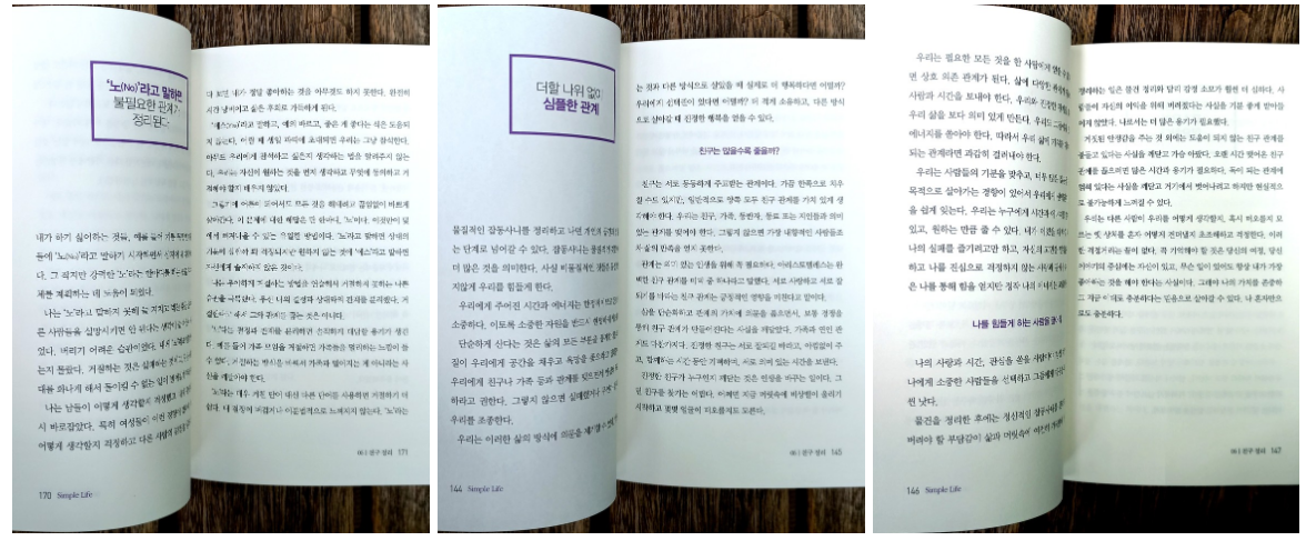 이 책에서 말해주는 건, 인생을 잘 살고 싶으면 단순하게 살아라, 뭐 물건을 늘어내고 살 필요 없다는 말을 전달하는 것이다. 그리고 사람또한 마찬가지, 진정으로 내 곁에 있어줄 사람만 만드는 게 필요하고 불필요한 존재는 거르는 게 답이라고. 마음또한 아픈 과거에만 안주하기 보다 더더욱 간단하게 해서 사는 게 자신에게 더더욱 신경쓸 수 있다고 말이다.