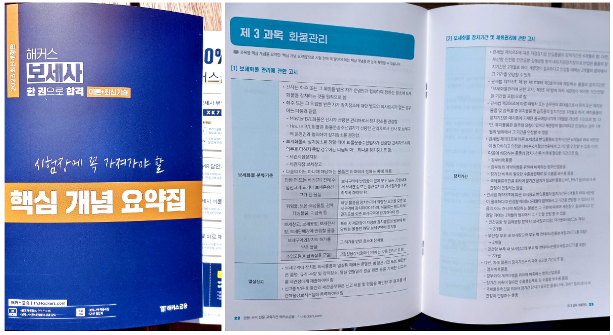 물품이 해외에서 수출입으로 물류가 자주 들어오고 있다보니 모든 물품관리하는 것이 상당히 쉽지가 않다. 인터넷으로 주문도 많은데다 곳곳에 수출입으로 들어오는 물품들이 세관공무원들이 전부 하지 않기 때문에 대리로 해주어야 할 업무가 바로 보세사다. 해당 자격증은 <보호할 보, 세금 세>로 쓰면서 보세화물관리에 전문적인 직무지식을 갖고 보세화물관리에 대한 세관공무원의 업무 중 일부를 위탁받아 수행하는 업무를 하는 것인데 이에 대한 전문적인 자격증이 요구되고 있다. 이에 대한 준비를 하려면 상당히 법에 대한 개념을 알고 접근해야 하므로 만만치가 않은 국가자격증이다. 이를 준비하기 위해 우리는 어떤 걸 봐야할지 알아보고자 해커스 보세사 자격증 교재를 보기로 하였다.