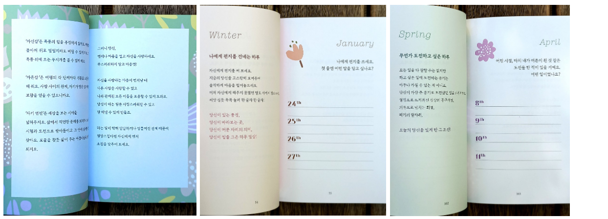 대부분 다이어리책을 보게 되면 써야 할 분량이 많기 때문에 매일매일 작성하려고 하다보면 그날이 그 날 같아 별로 쓸 말이 없거나 꾸준하게 잘 써지지 않을 때가 있어 서서히 다이어리가 방치가 될 때가 있다. 쓰다 말다 반복되다보니 다이어리가 연말에 출시가 되어도 사는 것조차 겁이 나게 되는데, 이 도서는 왠지 모르게 한 편의 작은 글자라도 남겨놓고 싶은 생각이 들게 해준다.