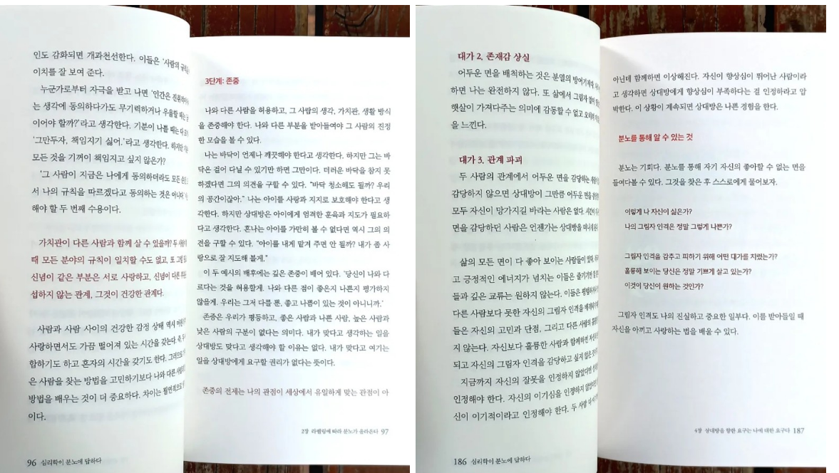 오히려 난 현재 읽고 있던 <심리학이 분노에 답하다>라는 책에서 자신의 분노에서 비추어지는 상처와 억울함, 눈물, 그동안에 쌓인 응어리가 한꺼번에 일어나고 있는 이 감정을 추스리기 위한 이해도를 높이며 자신을 진정시킬 수 있는 마주함이 필요하게 생각할 수 있도록 심리치료법을 일러준다.그게 자기 안의 분노를 탐구할 수 있는 <내 마음 속 분노 살펴보기>를 통해 자신의 분노를 어느 방향으로 하고 있고 이에 대한 잘못된 것이 무엇인지 알 수 있다.내가 분노하면 대부분 사람들의 반응이 어떠한지를 행동들을 알려주므로써, 분노를 표출하는 요령을 터득하는데 많은 공감을 가지게 설득을 많이 해주고 있는 걸 볼 수 있다.