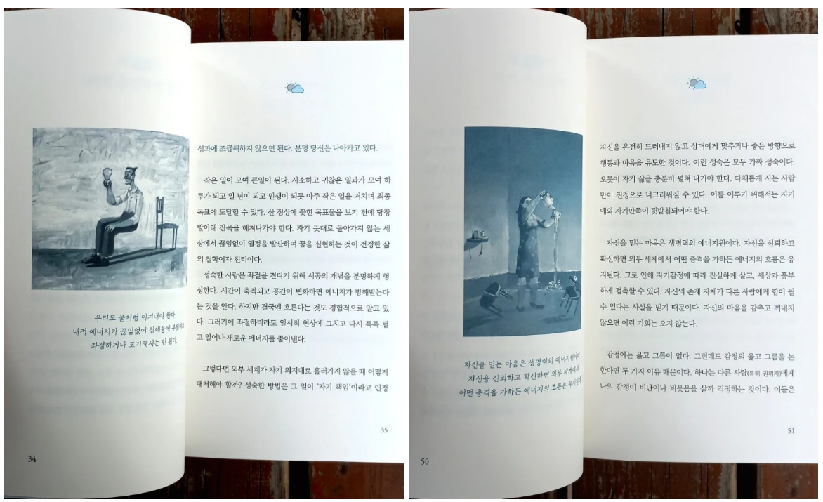 이 책을 보다보면 처음엔 심오하고 접근하는데 시간을 들을 거 같아도, 이 책을 두 번이상 읽다보면 자신이 미처 내비치 못했던 감정과 에너지가 무엇인지를 깨닫게 해주는 구절을 마주할 수 있게 된다.