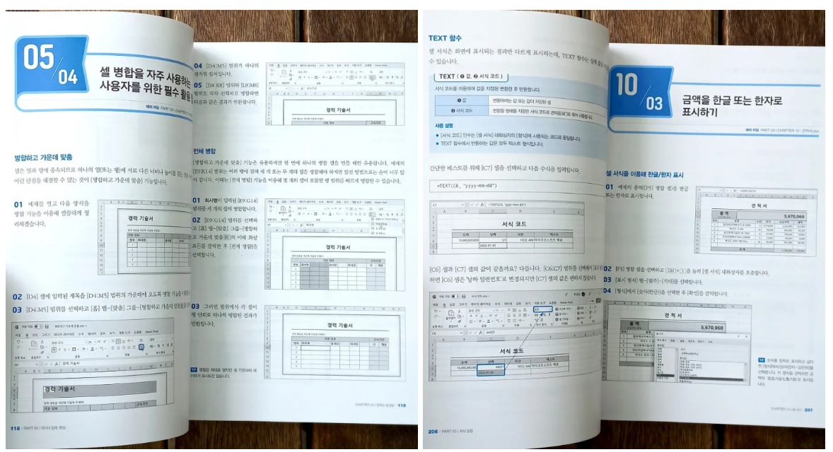 문서작성할 때 필수로 내야 하는 보고서로 많이 쓰이기 때문에 대부분의 기능을 숙지해야 할 내용들이 가득하다. 하나하나 보기엔 벅차지만 모르는 부분을 바로바로 찾아서 볼 수 있는데다 처음 엑셀을 다루신 분들을 위한 것처럼 꼼꼼하고 세세한 과정을 설명해주고 있어서 빠르게 단련하는데 도움이 된다.그리고 기본 기능을 가지고 응용해서 가끔씩 사용하는 경우가 있는데 이를 빠른 지름길로 갈 수 있는 방향까지 제시해주고 있어서 일이 차질없이 빠르게 속전속결로 마무리가 가능해질 수 있다.