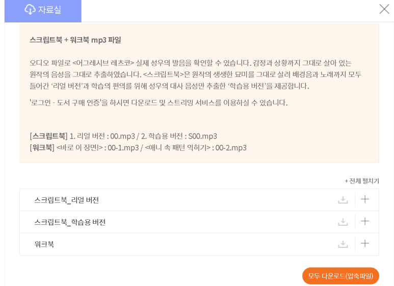 이 책으로 공부하기에 앞서 먼저 mp3를 먼저 다운을 받아두는 것이 좋을 거 같다. 개인적으로는 pc버전으로 <길벗 이지톡>홈페이지에 들어가서 3가지 자료를 다운 받아 학습하는 것이 좋을 거 같다. BGM음성을 삭제한 채 오로지 성우들의 대화를 들을 수 있는 학습용버전도 있고 실제 애니버전 그대로 녹음된 음성도 있어서 공부하는데 골고루 귀와 입이 트이게 해주는 효과를 느낄 수 있게 되며, 중요장면 30개를 학습하면서 보게 되는 음성파일이 담아진 워크북까지 있어서 골고루 다양하게 귀에 익숙해질 수 있도록 만들어진 회화편 다방면 음성파일을 들을 수 있게 된다.