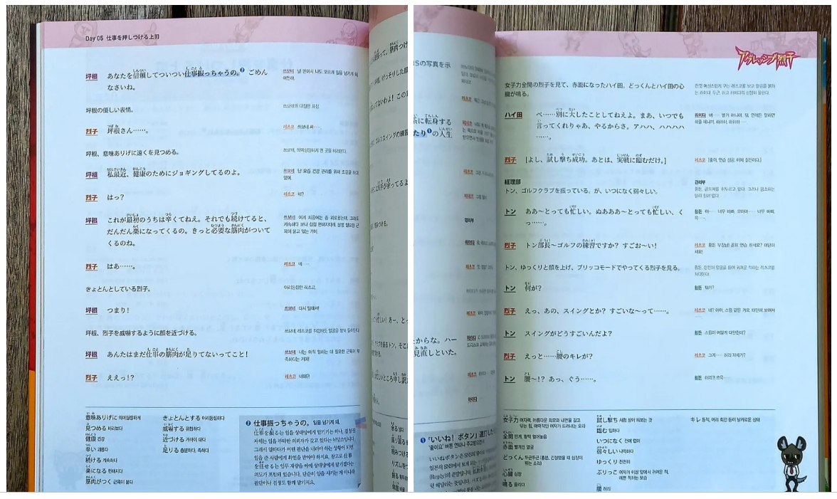 이 책에 나온 내용은 속어보다 표준어 위주로 많이 담아져 있으며 성우들의 발음으로 빠르게 발음을 익숙해지는데 친근하게 다가온다. 전형적인 원어민 발음을 듣는 것보다 실제로 말하게 되는 상황극으로 들을 수 있어서 더더욱 실감난다. 그리고 일본어 스터디를 만들어서 이 책으로 공부를 시작한다면 더더욱 상황극을 하면서 문장을 기억하기에 좋을 거 같다. 대화 내용은 한글로 표기하지 않은데다 어려운 한자가 적어진 거라면 요미가나로 적어져 있어서 일본어 문자만 안다면 읽는데 불편하지 않을 거 같다.