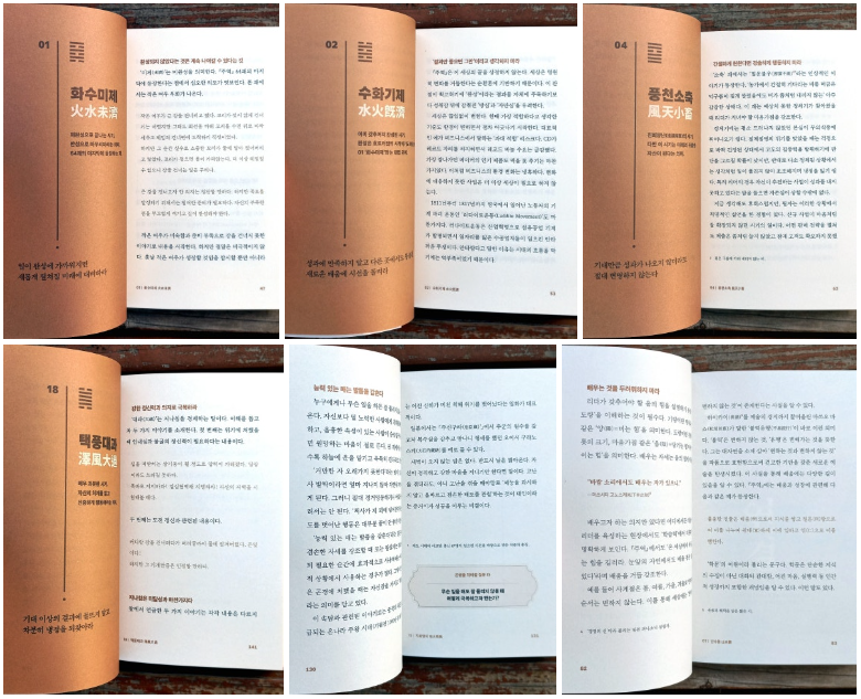 본문을 보게 되면 수화기제(결과만 좋으면 그만이라는 생각을 하지 말라), 수뢰준(새로운 도전은 고통과 시련이 있으나 포기하지 않으면 실패는 없다), 풍지관(보이지 않는 중요한 부분까지 세밀하게 살펴라), 지풍승(순조롭게 진행되는 상황에서 감춰진 위험 감지할 것), 풍천소축(내 기대만큼 성과나지 않다고 변명과 불평불만 하지 말 것. 실패를 거름삼아 묵묵히 견디고 다시 전진해볼 것) 등등 이런 한자어를 한마디로 말해도 내 인생의 결정적 선택에 역할을 해주기도 한다. 또한, 지금 이 순간 나는 살아남기 위해 줏대있게 의지의 축을 얼마나 단단하게 가지고 있는지 생각해보게 한다.